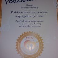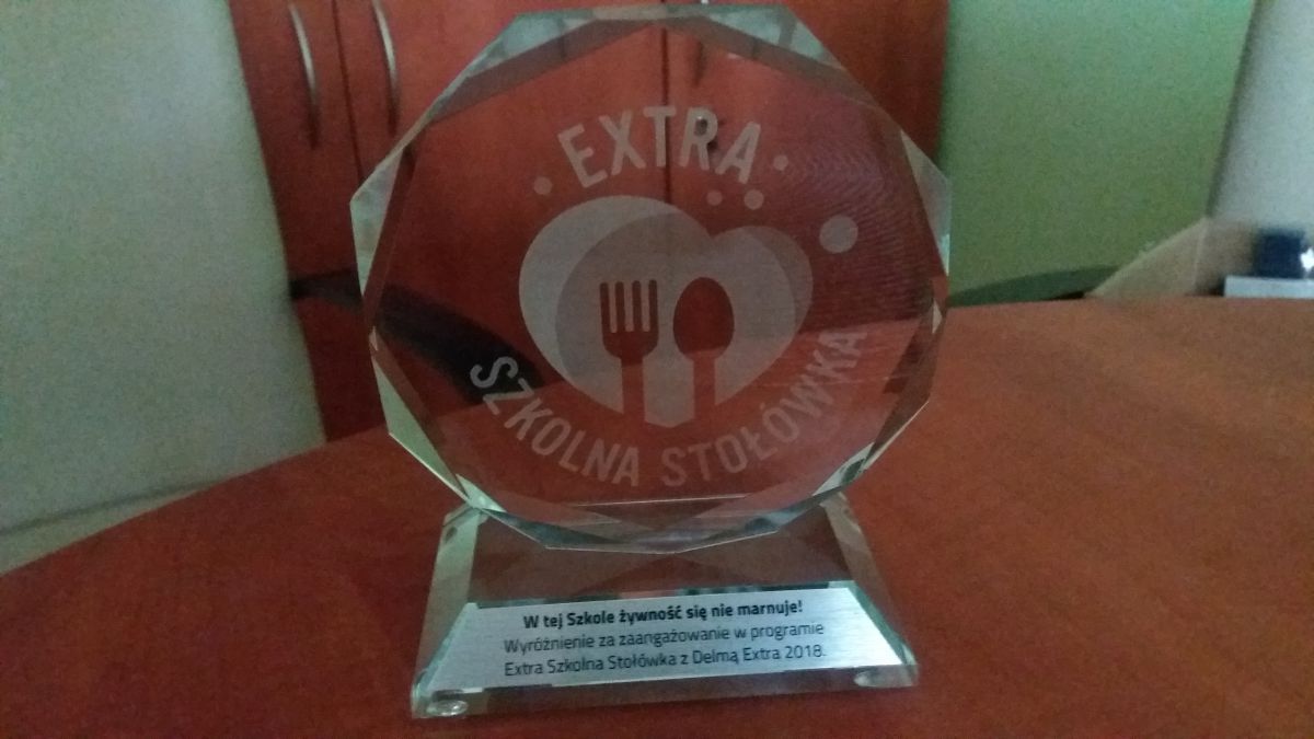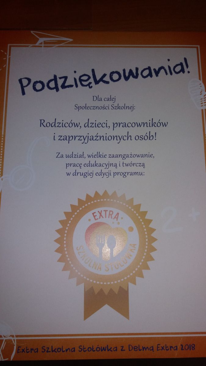 W ubiegłym roku szkolnym uczniowie naszej szkoły uczestniczyli w ogólnopolskim programie „EXTRA SZKOLNA STOŁÓWKA”. Celem tego programu była edukacja uczniów na temat niemarnowania żywności i modernizacja stołówek szkolnych. Uczniowie musieli wykonać kilka zadań programowych, w tym plakat przedstawiający „stołówkę naszych marzeń” oraz nagrać filmik przedstawiający różne sposoby wtórnego wykorzystania żywności, a nauczyciele przeprowadzić lekcje dotyczące zdrowego odżywiania się. W zdobywaniu punktów dla szkoły wspierali uczniów rodzice, którzy głosowali na opublikowane na Stronie Internetowej Prace Programowe. Zdobywając 15481 punktów udało nam się znaleźć w gronie 50 szkół, które uzyskały nagrodę II stopnia w postaci warsztatu przeprowadzonego przez Bank Żywności dla Szkoły oraz zestawu naklejek ściennych do szkolnej stołówki. Wszystkim rodzicom i sympatykom naszej szkoły dziękujemy za wsparcie i aktywne głosowanie.