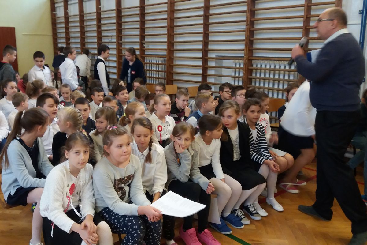 Dnia 9 listopada 2017 r .uczniowie naszej szkoły zgromadzili się na sali gimnastycznej, aby uczestniczyć we wspólnym śpiewaniu pieśni patriotycznych, jako wyraz pamięci i wdzięczności dla tych, którzy walczyli i ginęli za odzyskanie dla Polski niepodległości. Uczniowie przygotowali na tę okazję uroczyste stroje i emblematy w barwach narodowych.