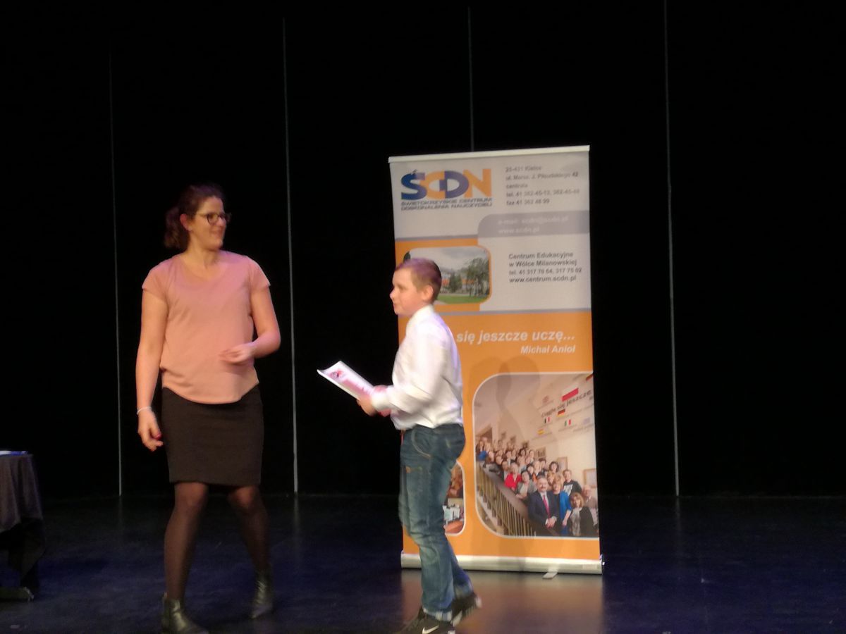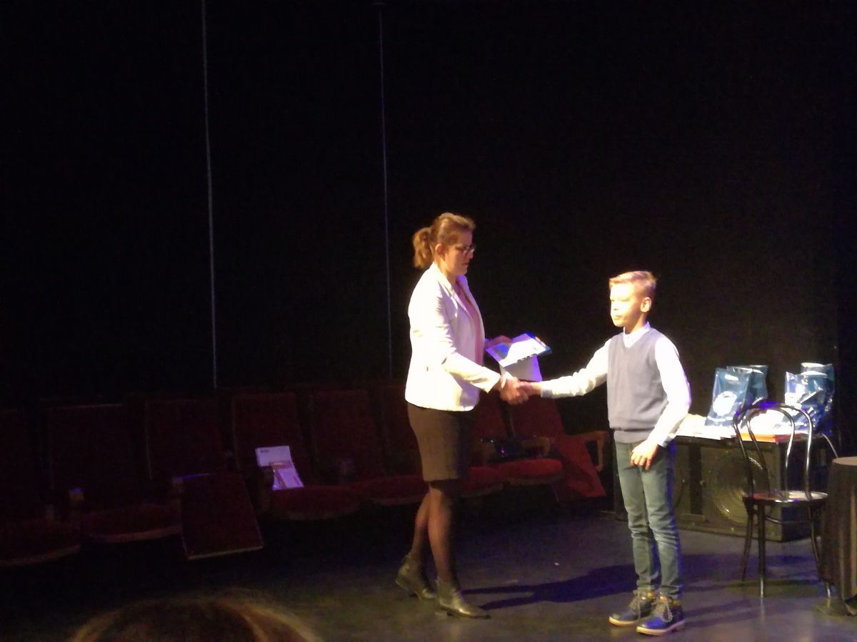 Alan Chruścicki uczeń klasy VI b zajął II miejsce w kategorii uczniów starszych (klasy V-VII) wykonując wiersz: „O Captain! my Captain!” autor: Walt Whitman.