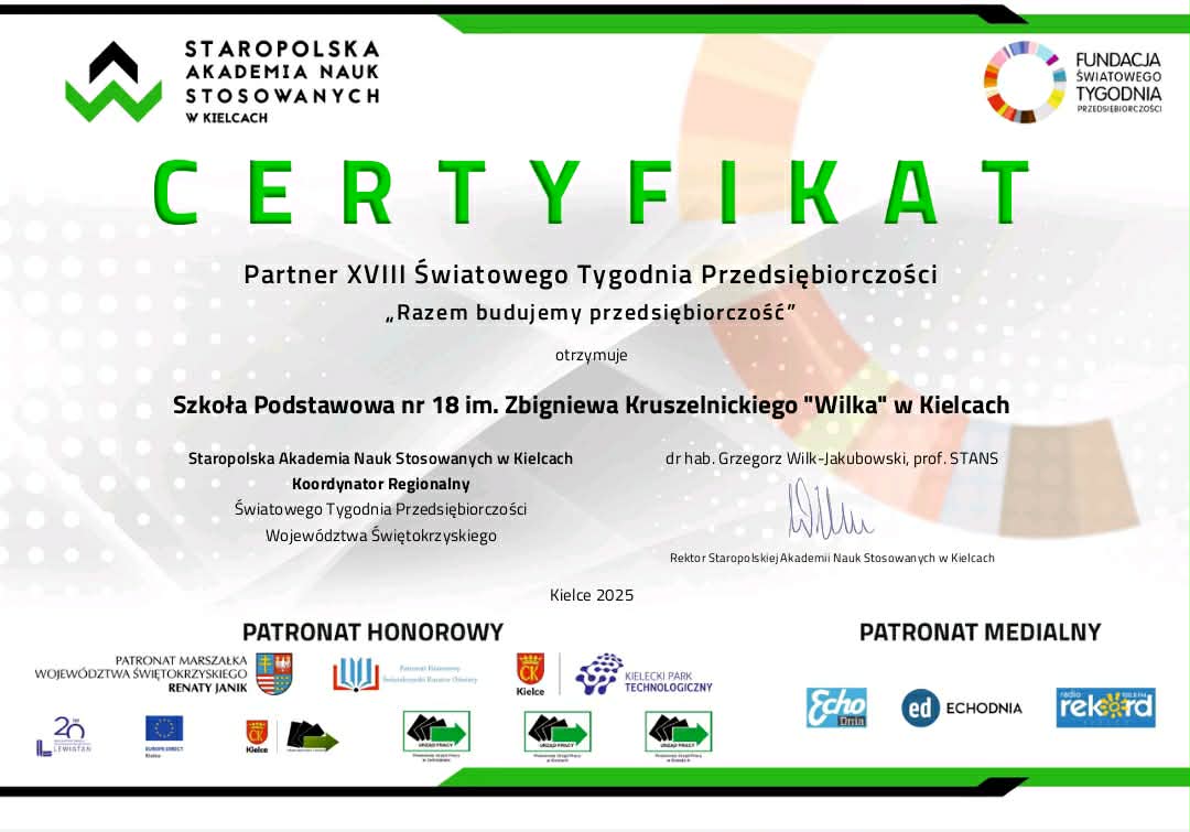 Z dumą informujemy, że Szkoła Podstawowa nr 18 im. Zbigniewa Kruszelnickiego „Wilka” w Kielcach otrzymała Certyfikat Partnera XVIII Światowego Tygodnia Przedsiębiorczości pod hasłem „Razem budujemy przedsiębiorczość”
