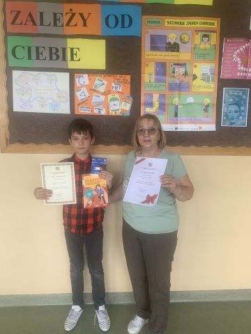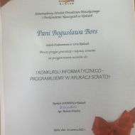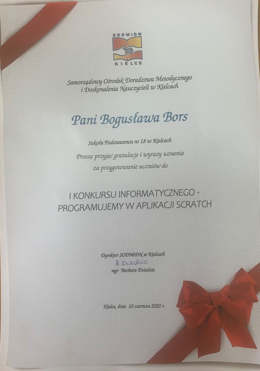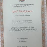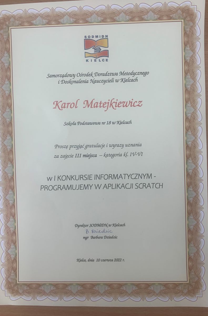 Karol Matejkiewicz uczeń klasy 4b zdobył trzecie miejsce w I Konkursie Informatycznym - "Programowanie w aplikacji Scratch". Konkurs zorganizowany został przez Samorządowy Ośrodek Doradztwa Metodycznego i Doskonalenia Nauczycieli w Kielcach. Uroczyste podsumowanie Konkursu odbyło się 10 czerwca 2020 roku w siedzibie organizatora. Do Konkursu przygotowała Karola pani Bogumiła Bors.