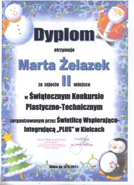 Uczennica klasy VII a Marta Żelazek zajęła II miejsce w Świątecznym Konkursie Plastyczno – Technicznym zorganizowanym przez Świetlicę Wspierająco – Integrującą „PLUS” w Kielcach. Jej praca to choinka z białych piórek wybrana spośród 200 prac.