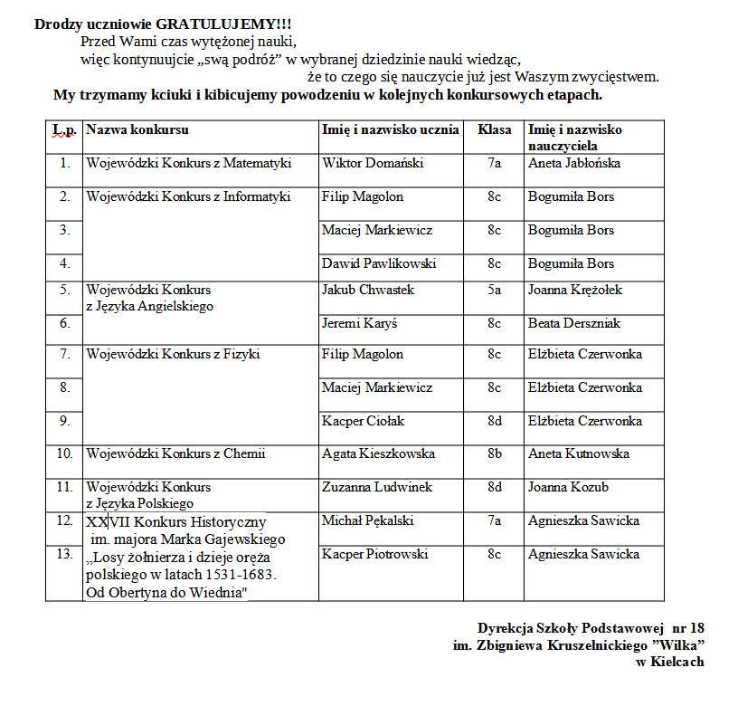 Uczniowie naszej szkoły zakwalifikowani do II etapu konkursów przedmiotowych w roku szk. 2021/22
