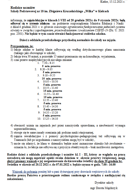 Informacja o organizacji pracy szkoły od 20.12.2021 r. do 09.01.2022r.