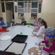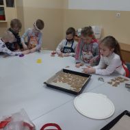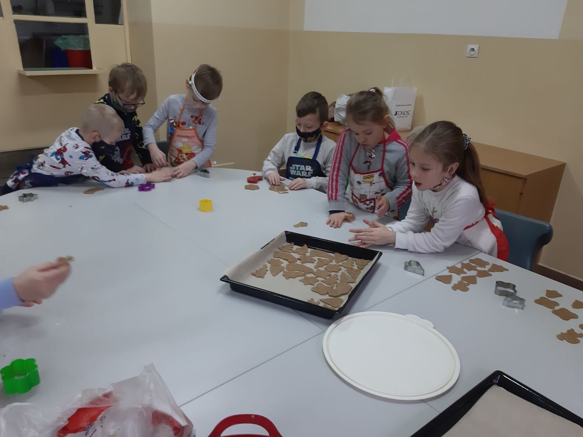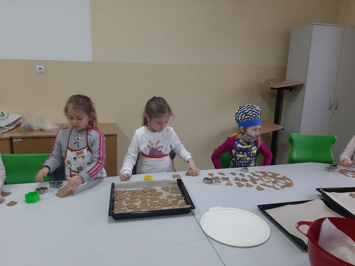 18 grudnia 2020 r. w stołówce szkolnej z wielką radością i zaangażowaniem zagniatały i wałkowały piernikowe ciasto, pięknie wycinały foremkami kształty związane z motywami świąt Bożego Narodzenia. Następnie upieczone pierniki