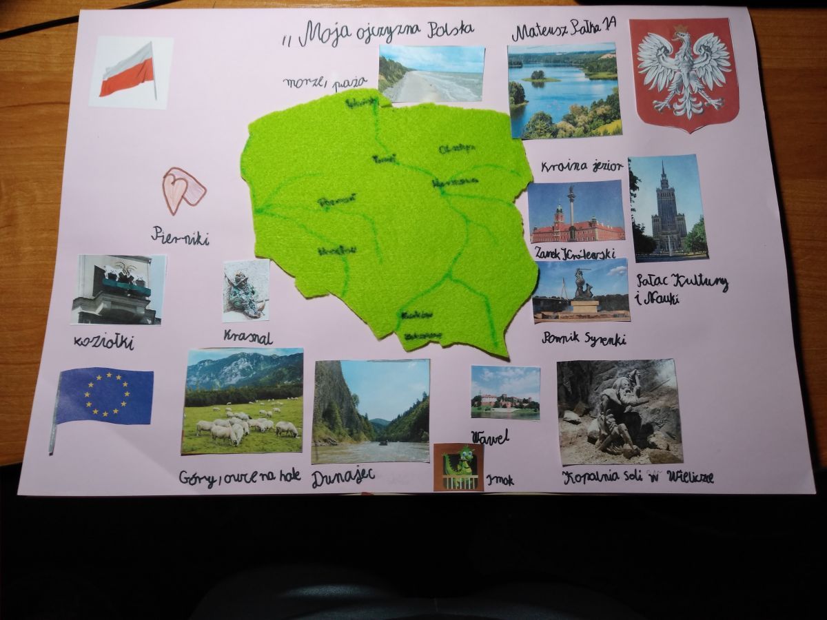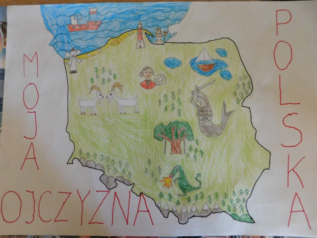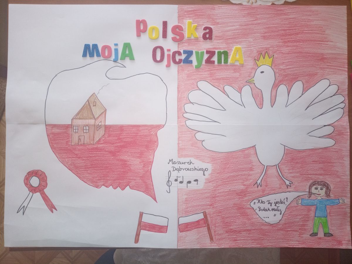 Uczniowie klasy 1 a realizowali w tym tygodniu tematy związane z naszą Ojczyzną Polską. Utrwalili znajomość symboli narodowych, poprzez filmy edukacyjne poznali ciekawe miejsca i zabytki w Polsce, zdobyli podstawy wiedzy na temat Konstytucji 3 Maja, poznali znaczenie słowa „patriota”. Podsumowaniem tych zajęć było przygotowanie przez uczniów prac na temat: „Moja ojczyzna Polska”, wykonanych według własnego pomysłu. Nie wszyscy uczniowie wykonywali prace plastyczne. Niektórzy recytowali wiersze o Ojczyźnie, których nauczyli się na pamięć.