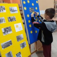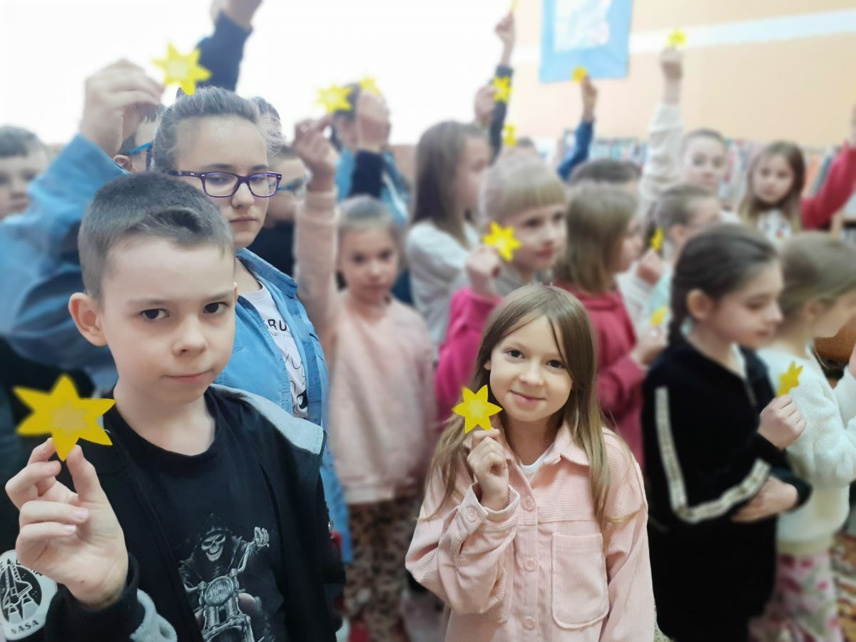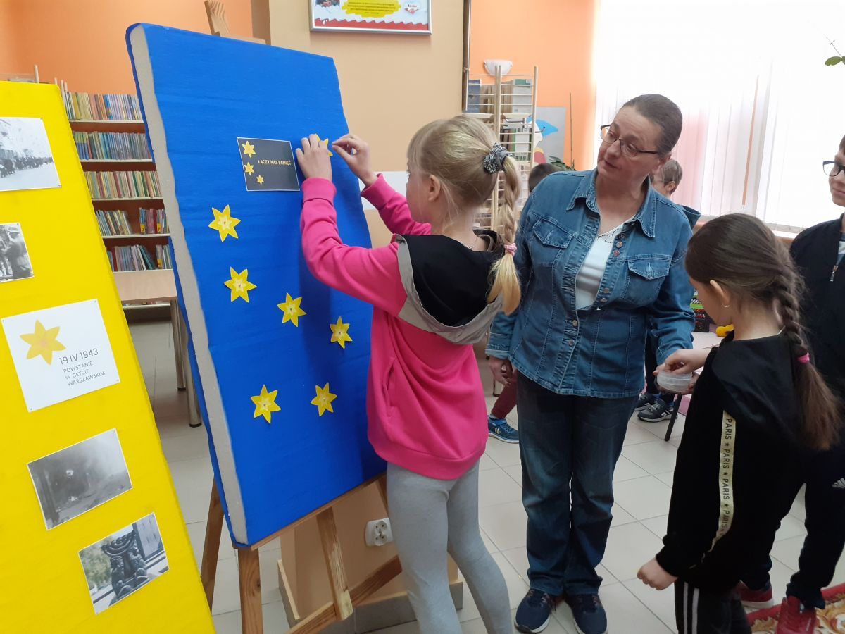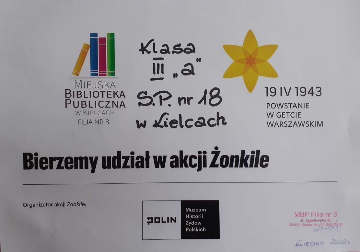 Uczniowie klasy 3a, na zaproszenie pracowników Miejskiej Biblioteki Publicznej w Kielcach Filia nr 3, brali udział w Ogólnopolskiej akcji społeczno-edukacyjnej Żonkile, której organizatorem jest Muzeum Historii Żydów Polskich POLIN. Akcja ta związana jest z przypadającą 19 kwietnia rocznicą wybuchu powstania w getcie warszawskim. Akcji od początku towarzyszy hasło "Łączy nas pamięć", które podkreśla siłę wspólnoty, znaczenie solidarności, potrzebę dialogu. Uczniowie wysłuchali tekstu opowiadania Pawła Beręsewicza „Strasznie, strasznie”, które w przystępny dla dzieci sposób przedstawia trudne tematy związane z wojną i jej okrucieństwem. Potem wykonali żółte żonkile, które są symbolem zbiorowej pamięci.
