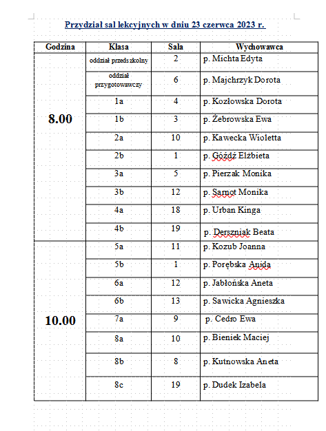 Przydział wychowawców, sal lekcyjnych oraz boków w szatni
