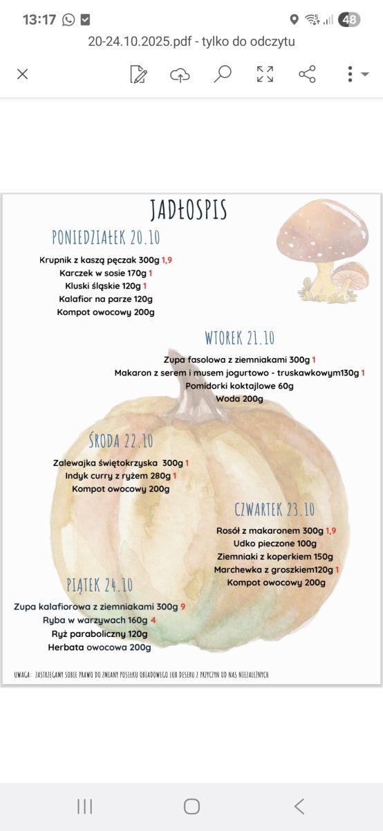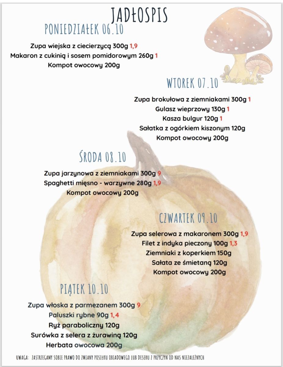 OPŁATA ZA MIESIĄC PAŹDZIERNIK 2025 r. WYNOSI: 147,00 zł za 21 dni żywieniowych