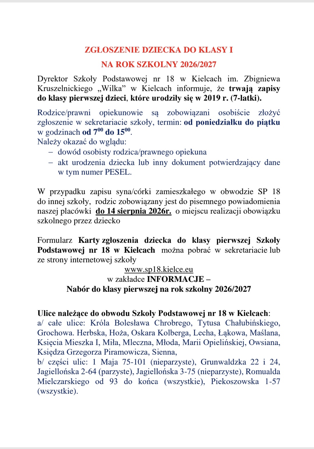• Nabór do pierwszej klasy w roku szkolnym 2026/2027