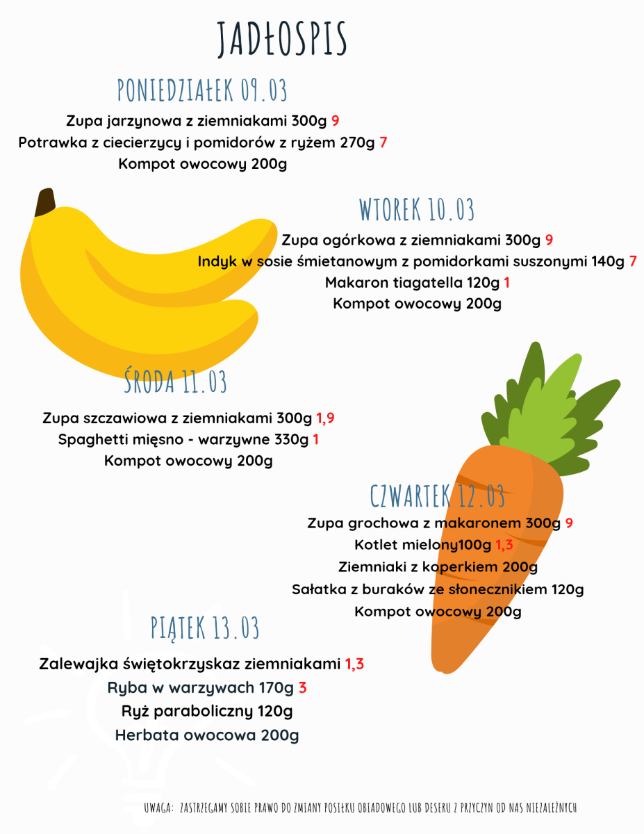 - W szkole wywieszony jest jadłospis tygodniowy, zatwierdzony prze dyrektora szkoły i intendenta.